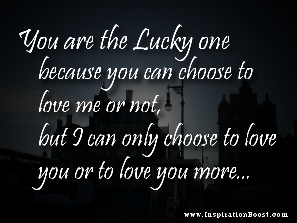 You Are The Lucky One Leave a Comment / All Quotes, Relationship Quotes / By Darren Chow You are the lucky one because you can choose to love me or not, but I can only choose to love you or to love you more…